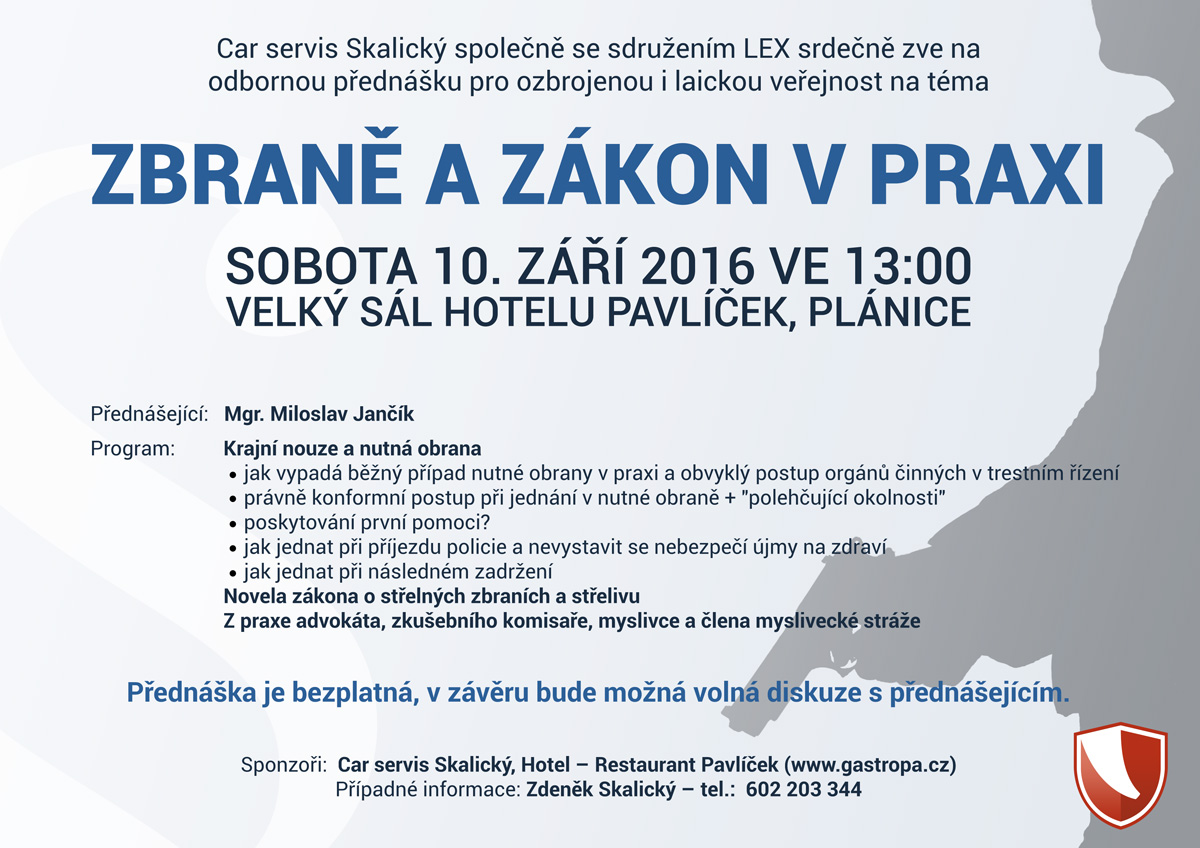 Car servis Skalický společně se Sdružením LEX srdečně zve na odbornou přednášku pro ozbrojenou i laickou veřejnost na téma: „Zbraně a zákon v praxi“, která se bude konat v sobotu 10.09.2016 ve velkém sálu Hotelu – Restaurantu Pavlíček, nám. Františka Křižíka 133, okr. Klatovy.
